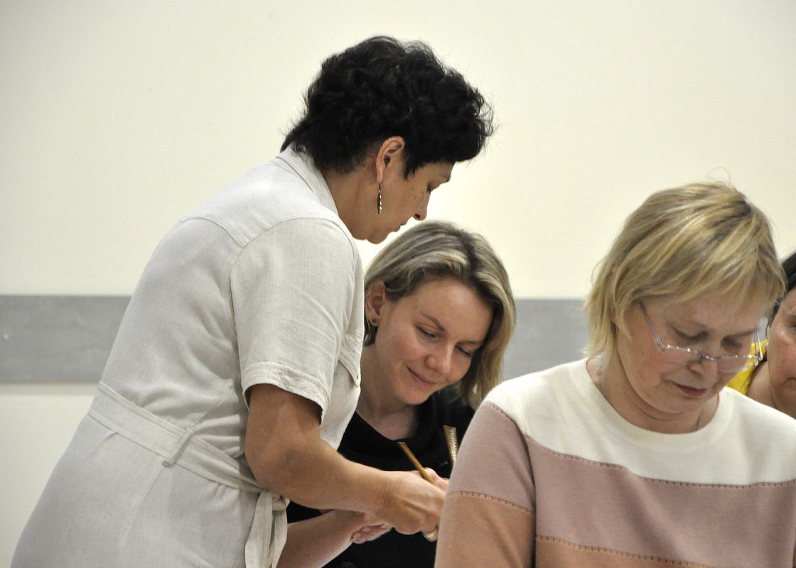 «Все участницы были очень старательные, трудолюбивые, все трудились как пчёлки. Оказалось, что многие задачи и вопросы — как тактировать, как вести себя с теми, кто отстаёт, и кто бежит вперёд, что делать левшам и другие — решаемы. Например, одна из участниц "загребала" левой рукой, при этом тетрадь у неё лежала как у правши, она не переворачивала её зеркально. К концу семинара она сказала: "Я поняла, что если левше всё сделать правильно: правильно положить тетрадь, правильно захватить перо и правильно сесть, то писать пером левой рукой можно прекрасно!"