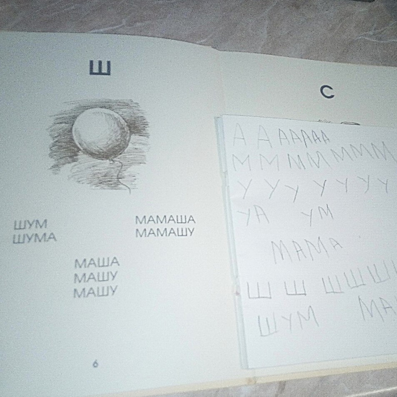 Артикуляционная зарядка. Звуковые упражнения. Повторение изученных букв. Изучение буквы Ш. Написание ряда букв в блокноте. Чтение Азбуки и обсуждение прочитанного. Письмо слов («печатание»). Рисование орнаментов в тетради в клетку. Обводка каллиграфического рисунка (шары).