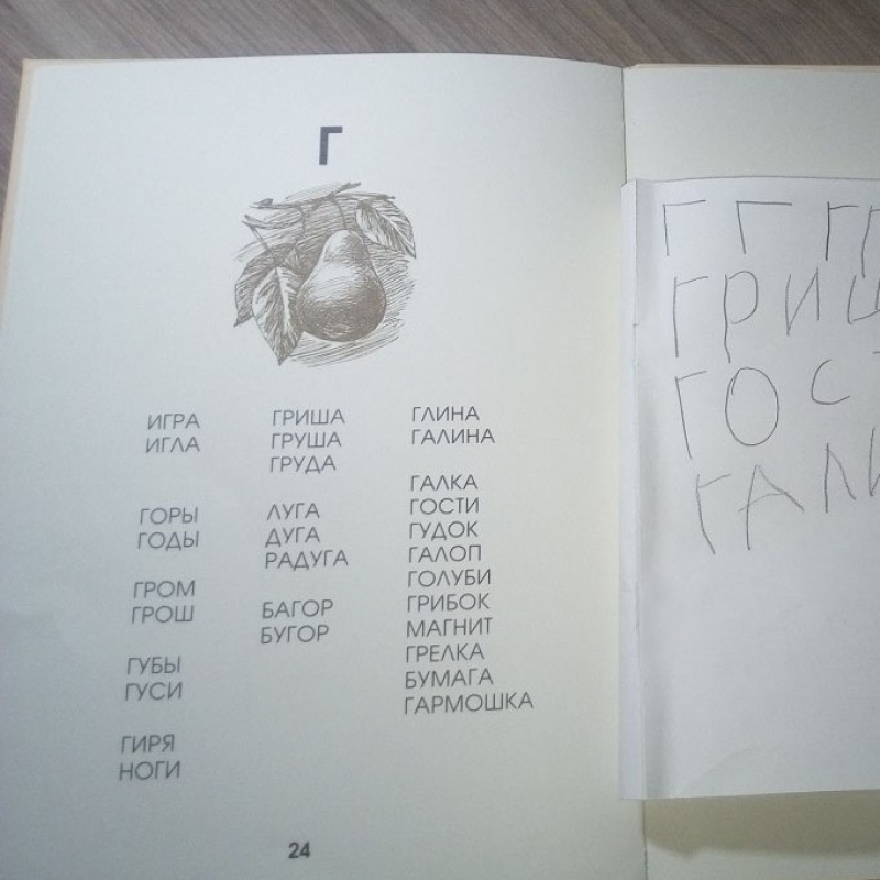 Артикуляционная зарядка. Звуковые упражнения. Повторение изученных букв. Изучение буквы Г. Написание ряда букв в блокноте. Чтение Азбуки и обсуждение прочитанного. Письмо слов («печатание»). Рисование орнаментов в тетради в клетку. Обводка каллиграфического рисунка (груша).