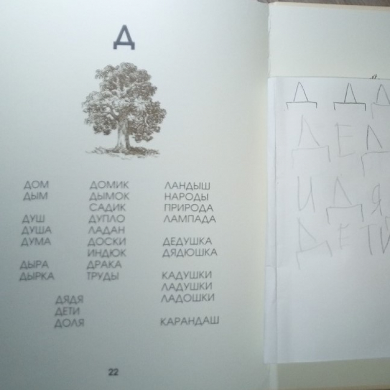 Артикуляционная зарядка. Звуковые упражнения. Повторение изученных букв. Изучение буквы Д. Написание ряда букв в блокноте. Чтение Азбуки и обсуждение прочитанного. Письмо слов («печатание»). Рисование орнаментов в тетради в клетку. Обводка каллиграфического рисунка (дерево).