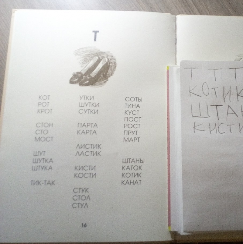 Артикуляционная зарядка. Звуковые упражнения. Повторение изученных букв. Изучение буквы Т. Написание ряда букв в блокноте. Чтение Азбуки и обсуждение прочитанного. Письмо слов («печатание»). Рисование орнаментов в тетради в клетку. Обводка каллиграфического рисунка (туфли).