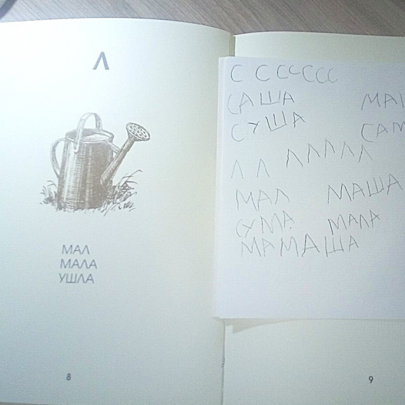 Артикуляционная зарядка. Звуковые упражнения. Изучение буквы Л. Написание ряда букв в блокноте. Чтение Азбуки и обсуждение прочитанного. Письмо слов («печатание»). Рисование орнаментов в тетради в клетку. Обводка каллиграфического рисунка (лейка).