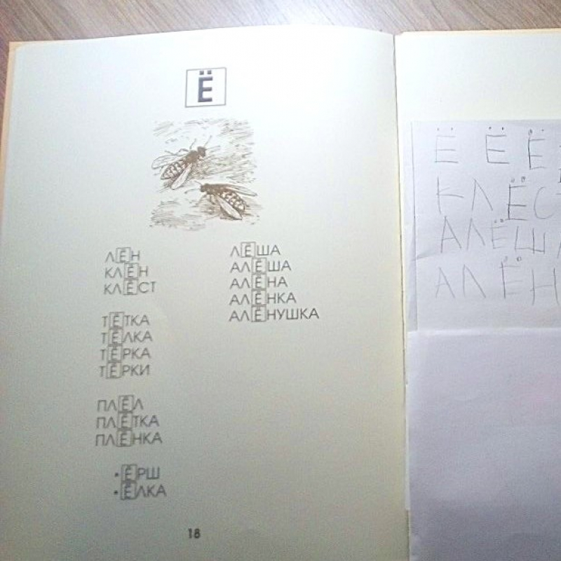 Артикуляционная зарядка. Звуковые упражнения. Повторение изученных букв. Изучение буквы Ё. Написание ряда букв в блокноте. Чтение Азбуки и обсуждение прочитанного. Письмо слов («печатание»). Рисование орнаментов в тетради в клетку. Обводка каллиграфического рисунка (осы).