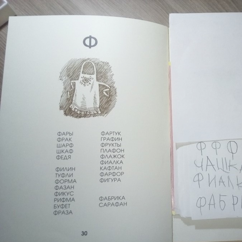 Артикуляционная зарядка. Звуковые упражнения. Повторение изученных букв. Изучение буквы Ф. Написание ряда букв в блокноте. Чтение Азбуки и обсуждение прочитанного. Письмо слов («печатание»). Рисование орнаментов в тетради в клетку. Обводка каллиграфического рисунка (фартук).