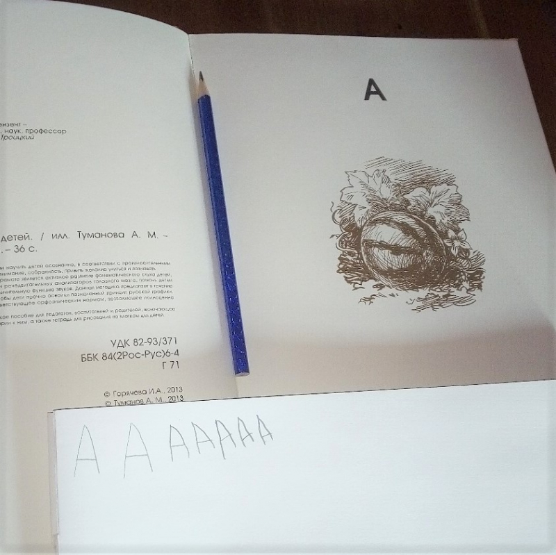 Предварительная беседа. Артикуляционная зарядка. Звуковые упражнения. Изучение буквы А. Написание буквы в блокнотах. Рисование орнаментов в тетради в клетку. Обводка каллиграфического рисунка (арбуз).