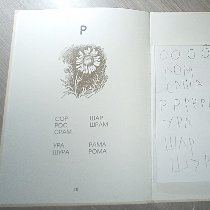 Артикуляционная зарядка. Звуковые упражнения. Повторение изученных букв. Изучение буквы Р. Написание ряда букв в блокноте. Чтение Азбуки и обсуждение прочитанного. Письмо слов («печатание»). Рисование орнаментов в тетради в клетку. Обводка каллиграфического рисунка (ромашка).