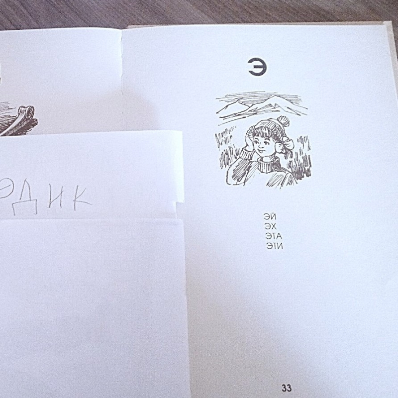 Артикуляционная зарядка. Звуковые упражнения. Повторение изученных букв. Изучение буквы Э. Написание ряда букв в блокноте. Чтение Азбуки и обсуждение прочитанного. Письмо слов («печатание»). Рисование орнаментов в тетради в клетку. Обводка каллиграфического рисунка (эхо).