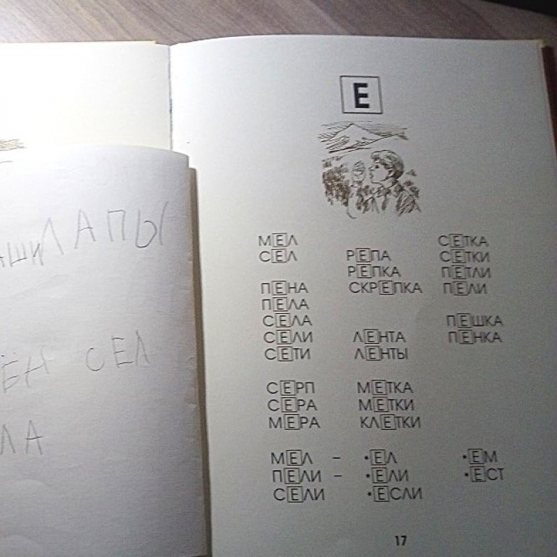 Артикуляционная зарядка. Звуковые упражнения. Повторение изученных букв. Изучение буквы Е. Написание ряда букв в блокноте. Чтение Азбуки и обсуждение прочитанного. Письмо слов («печатание»). Рисование орнаментов в тетради в клетку. Обводка каллиграфического рисунка (эхо).