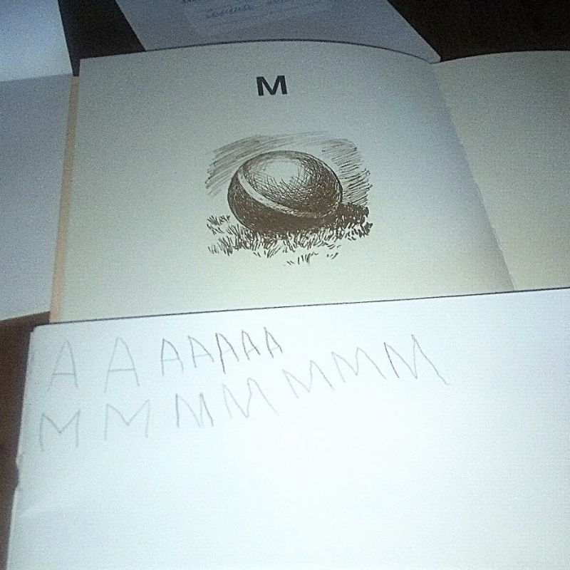 Артикуляционная зарядка. Звуковые упражнения. Повторение изученной буквы. Изучение буквы М. Написание буквы в блокноте. Рисование орнамента в тетради в клетку. Обводка каллиграфического рисунка (мяч).