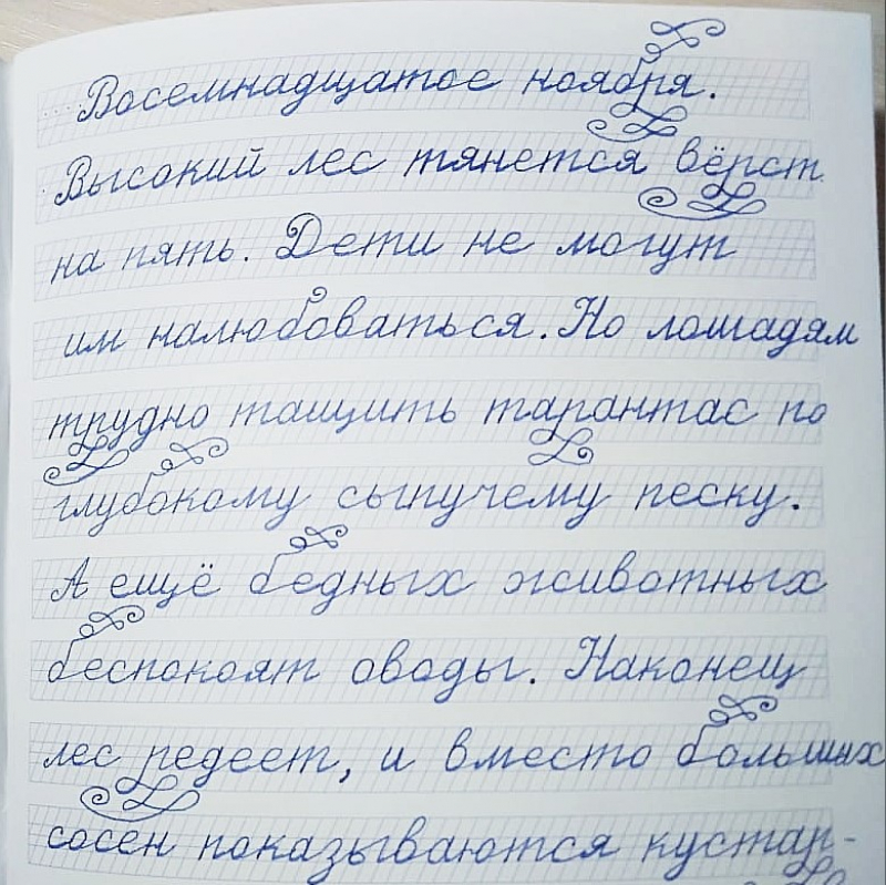 Переписывая текст в тетрадь, ребята словно сами пишут рассказ или сказку. Тетрадь становится книгой, а книгу хочется красиво оформить. Мы и не против! Ведь эти петельки и завитушки — любовь и трепетное отношение к русскому слову.